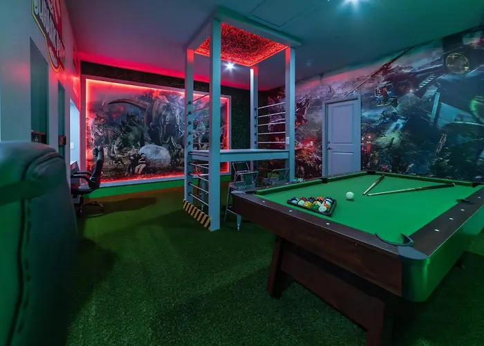 Last Minute Disney Private Pool Hot Tub Game Room Themed Bedrooms. Book Now Wc206 Orlando villa biedt een massagekamer, een bubbelbad en een overdekt zwembad voor een ontspannen ervaring en bevindt zich op 6 km afstand van het Showcase of Citrus. De villa verleidt gasten met schoonheidsbehandelingen en spatherapie en ligt op 10 minuten met de auto van de Thompson Aire Air Balloon Rides.